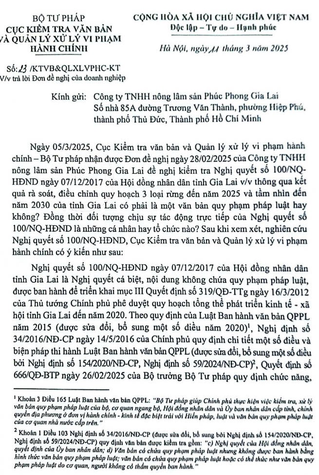 Theo Luật sư Ngô Thanh Quảng (bảo vệ cho bị cáo Phúc và Khoa) các bị cáo liên tục kêu oan, không phạm tội hủy hoại rừng là có cơ sở khi chứng cứ trực tiếp để buộc tội (Nghị quyết 100) không đảm bảo về tính pháp lý (không chứa quy phạm pháp luật). Ngoài việc đã viện dẫn các quy định của pháp luật để chứng minh Nghị quyết 100 không phải là văn bản quy phạm pháp luật, mới đây, Luật sư Ngô Thanh Quảng cũng đã nộp chứng cứ mới cho Hội đồng xét xử (HĐXX) để kháng định Nghị quyết 100 không phải là văn bản chứa quy phạm pháp luật (Văn bản của Cục Kiểm tra văn bản và quản lý xử lý vi phạm hành chính, Bộ Tư pháp kiểm tra hình thức nội dung của Nghị Quyết 100 theo đề nghị của Công ty Phúc Phong) (lsvn.vn/vu-an-huy-hoai-rung-o-krong-pa-can-lam-ro-nhan-dinh-cua-toa-an-cap-so-tham-ve-tinh-phap-ly-cua-chung-cu-buoc-toi-a159099.html).