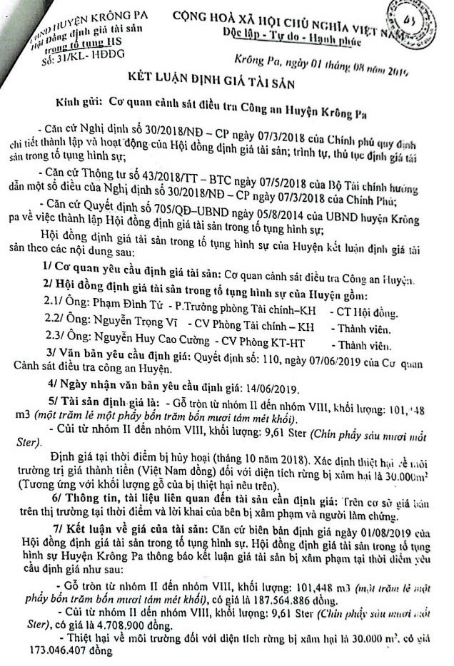 Theo hồ sơ tài liệu, căn cứ vào Quyết định trưng cầu định giá tài sản số: 110/YC–ĐGTS ngày 07/6/2019 của Cơ quan Cảnh sát điều tra (CSĐT), Công an huyện Krông pa, HĐĐG tài sản trong tố tụng hình sự huyện Krông pa gồm các ông Phạm Đình Tứ, Chủ tịch Hội đồng; ông Nguyễn Trọng Vĩ, Chuyên viên Phòng Tài chính - Kế hoạch; ông Nguyễn Huy Cao Cường, Chuyên viên Phòng Kinh tế - Hạ tầng tiến hành họp (ngày 01/8/2019) để định giá thiệt hại về tài sản và môi trường đối với khu vực các bị cáo tác động (30.000m2) và đã ban hành Văn bản số: 31/KL-ĐGTS ngày 01/8/2019 kết luận thiệt hại đối 101,448 m3 gỗ có giá trị là 187.654.886 đồng; 9,61 Ster củi có giá trị là 4.708.900 đồng và thiệt hại về môi trường rừng là 173.046.407 đồng.